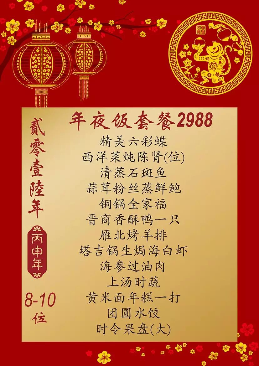 酒店2层山右中餐厅诚意出品 堂食:798元/份 外带:888元/份 查询预订:010-8206 3339